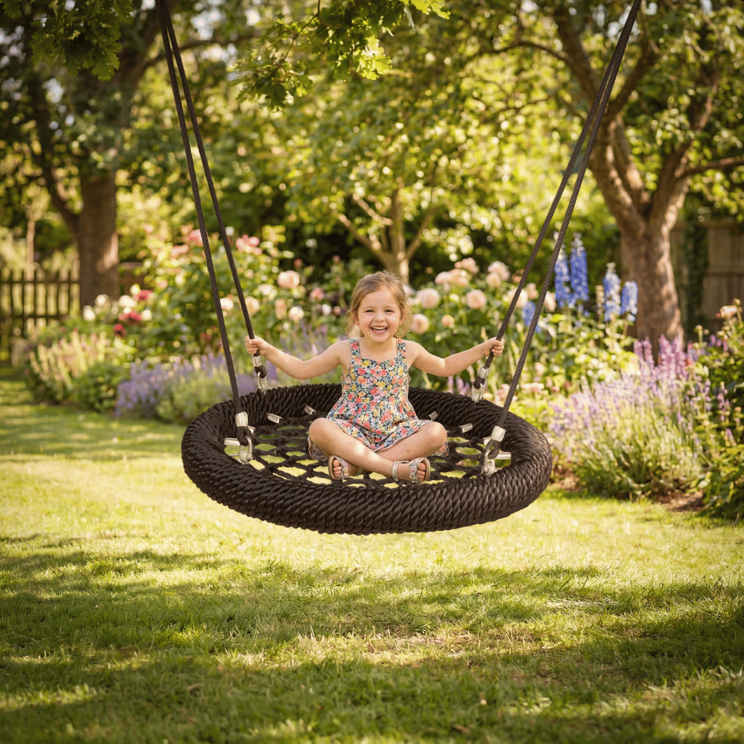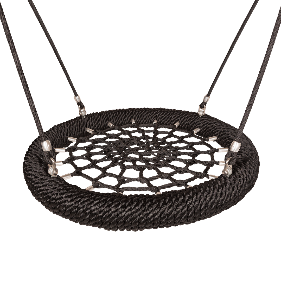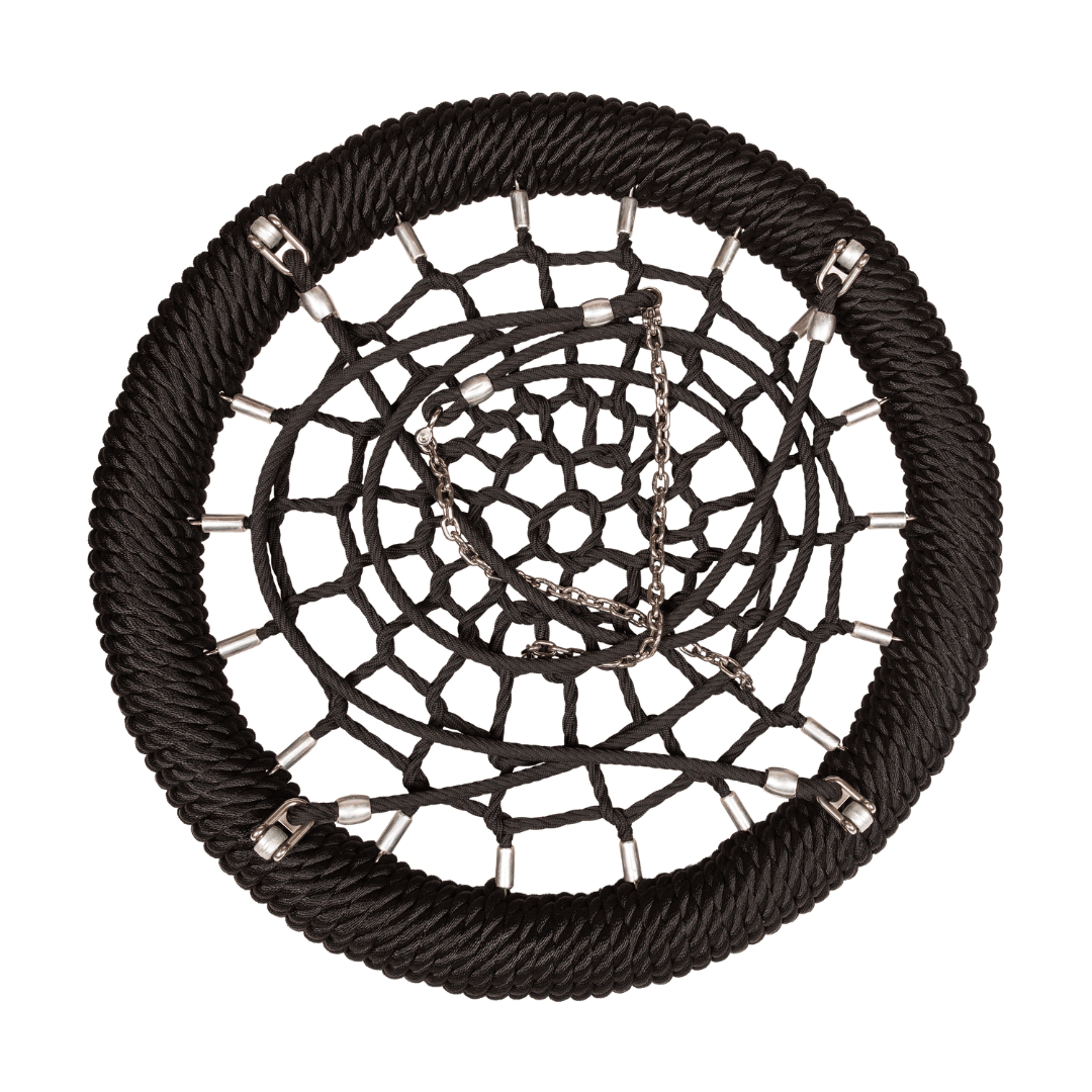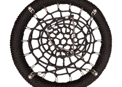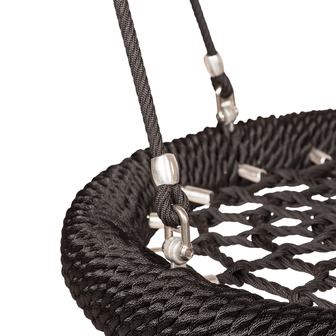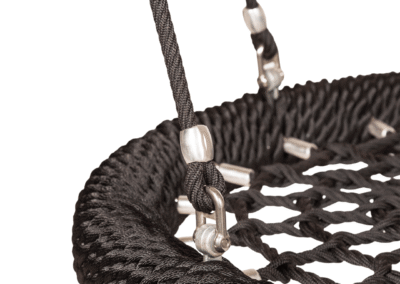 Gyngen er fremstillet i sort flet og har en kraftig rund ramme med flettet Taifunreb i siddefladen, som sikrer god komfort og lang levetid. Konstruktionen gør gyngen velegnet til både leg, korte pauser og sociale aktiviteter, og den rummelige gruppegynge giver plads til flere børn ad gangen.